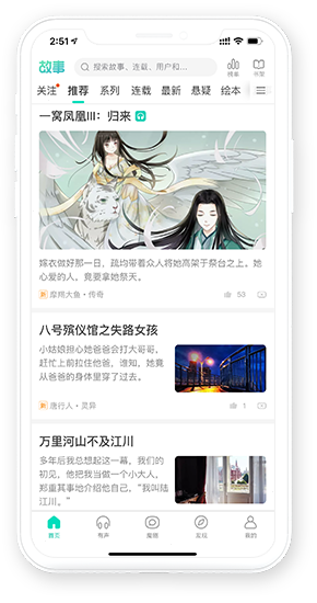 爱情、悬疑、奇幻、励志、灵异、有声、绘本等多类故事精选频道,个性化智能推荐引擎——看你喜欢的故事!